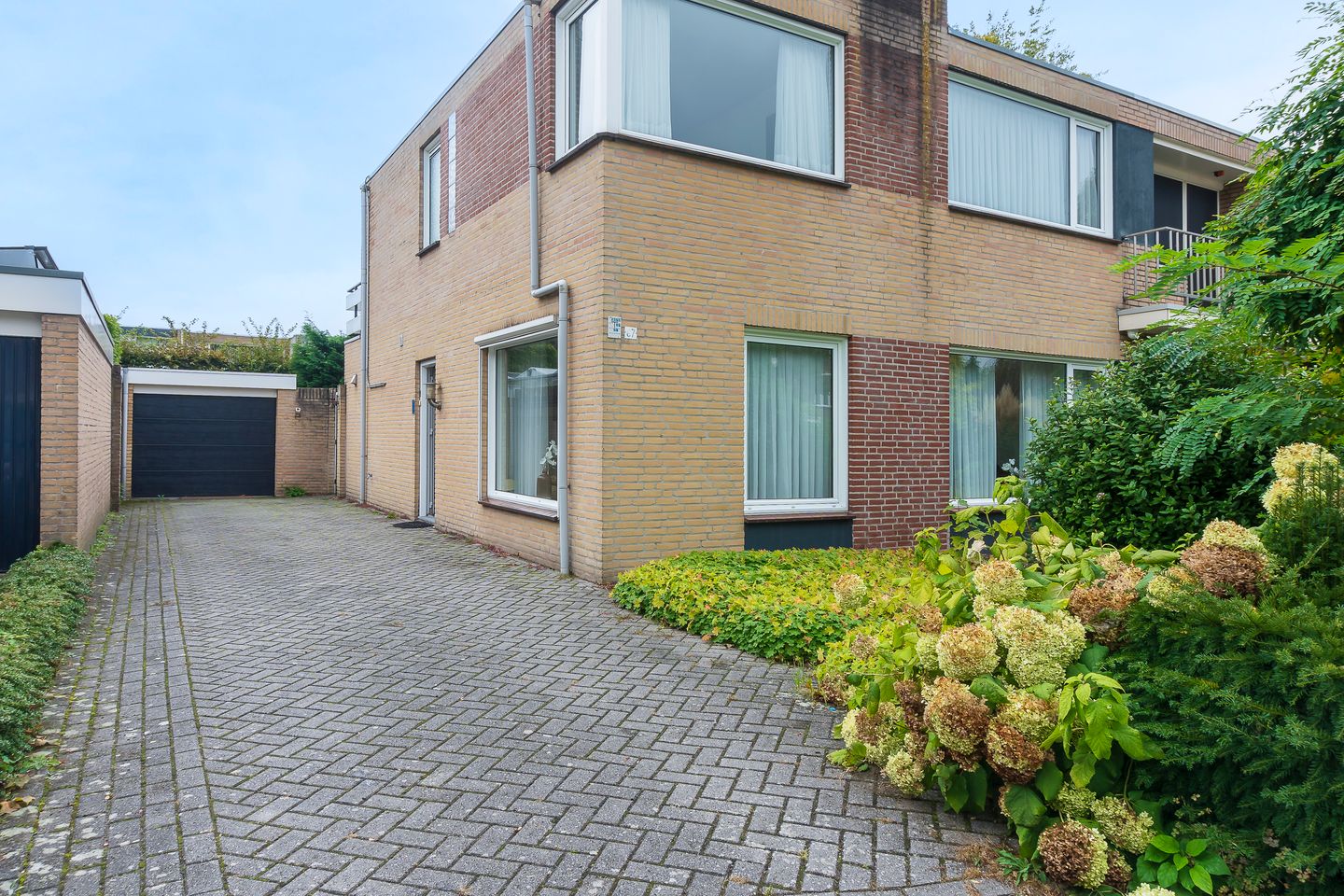 De woning heeft een diepe voortuin met diverse boompjes en beplanting. Langs de woning loopt een lange oprit tot aan de garage. De garage heeft een elektrische deur. Daarnaast is er water, verwarming en elektra aanwezig. De garage heeft twee deuren naar de achtertuin en ook via de oprit is de achtertuin bereikbaar. Naast de voordeur en aan de gevel van de garage zijn wateraansluitingen te vinden. De achtertuin is voorzien van een verhoogde vijver in het midden, een houten tuinhuisje achterin en diverse borders met beplanting. Aan de achtergevel (bij de keuken) hangt een elektrisch zonnescherm.