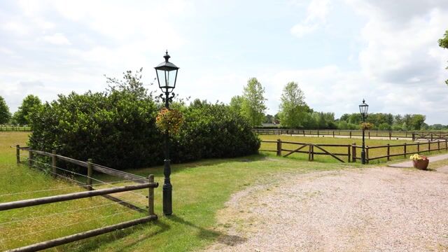 Het terrein is als een hoefijzer om de woning gesitueerd en ingericht voor de serieuze paardenhouder: een professioneel ingerichte paardenbak van 20 x 40 meter met eb & vloed bodem, een longeercirkel en stapmolen met bewateringssysteem, 3 paardenboxen en zadelkamer in een robuuste kapschuur met hooizolder. Daarnaast zijn de weilanden rondom met houten omheining gekoppeld aan elkaar waardoor de paarden vrij rond kunnen lopen. Er is voldoende hooiproductie in kruidige samenstelling op eigen grond.