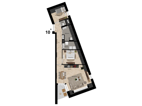 De living van 30 m² is die fijne zithoek aan de voorzijde, met een charmante dakkapel die zorgt voor extra ruimte en lichtinval, terwijl je uitkijkt over de daken van Tubbergen. Het zachte avondlicht vult de ruimte en zorgt voor een warme, uitnodigende sfeer. De open keuken is naadloos geïntegreerd in de woonkamer en nodigt uit tot gezellige etentjes of een ontspannen koffiemoment. Via de schuifpui stap je het balkon op, een beschut plekje waar je aan het eind van de dag nog net die laatste zonnestralen opvangt. Een glimp van de ondergaande zon maakt het plaatje compleet.