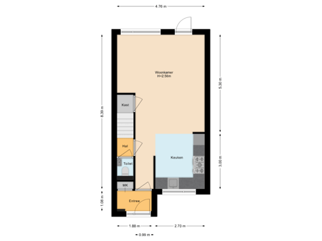- 53 m² (9,97 meter diep en 5,36 meter breed)