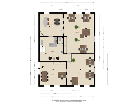De entree leidt naar een vestibule en vervolgens naar een centrale hal die toegang biedt tot alle hoofdvertrekken. De ruime L-vormige woonkamer aan de linkerzijde is licht en comfortabel, met openslaande deuren naar een vlonderterras. Deze ruimte is momenteel in gebruik als ontvangst- en presentatieruimte. Rechts bevindt zich de keuken met uitzicht op de voortuin. De inrichting en apparatuur zijn functioneel, maar gedateerd. Via de hal zijn tevens een slaapkamer, een moderne toiletruimte en een badkamer met inloopdouche, wastafelmeubel en aansluiting voor wasapparatuur bereikbaar.