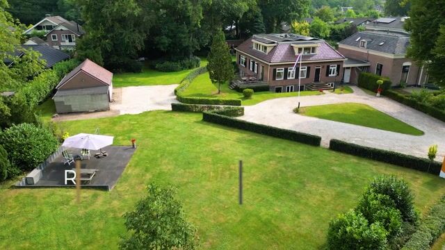De rondom gelegen tuin is royaal en met zorg aangelegd. Meerdere terrassen bieden ieder een eigen sfeer en mate van privacy. Aan de voorzijde ligt een statige oprijlaan met groenplantsoen, hoge vlaggenmast en acht parkeerplaatsen. Deze leidt naar een vrijstaande garage met berging, carport en een extra parkeerplek. Achterin de tuin bevindt zich een charmante kapschuur met pannendak, ideaal als berging of veranda. Het geheel wordt omlijst door volwassen bomen, sierbestrating, hagen en een ruim gazon – perfect voor ontspanning en buitenleven.