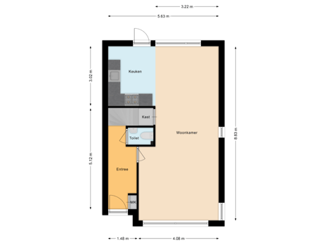 Wanneer je via de voordeur deze woning betreedt, kom je eerst terecht in een mooie entree, waar je ruimschoots genoeg plek hebt om een garderoberuimte te creëren. In de entree vind je ook de meterkast, de trapopgang en de toegangsdeur tot een afgezonderde toiletruimte. Laatstgenoemde is uitgerust met volledige betegeling, een staand toilet en een fonteintje.