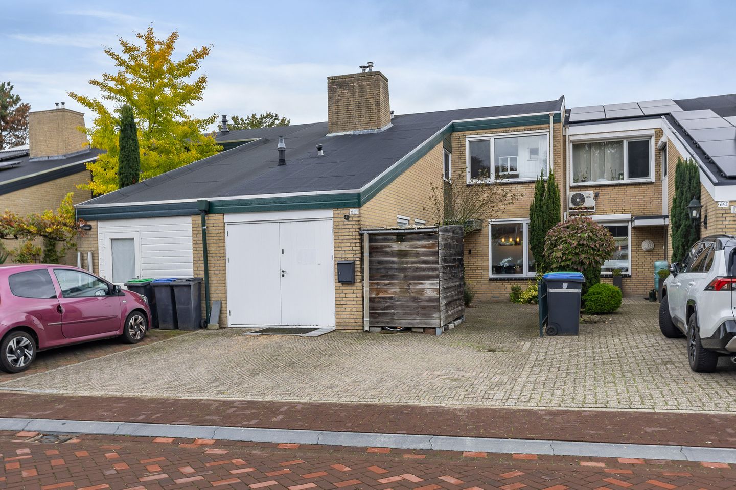 Aan de voorzijde is nog een houten berging geplaatst waar je gemakkelijk de fietsen in kwijt kunt. Je auto kun je natuurlijk op eigen terrein parkeren.