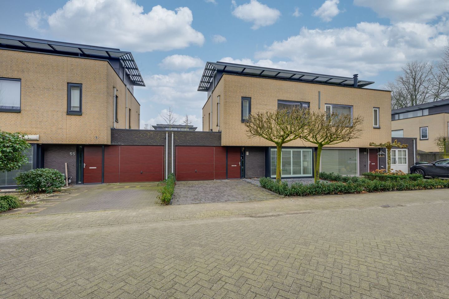 Via de oprit is de overdekte entree van de woning te bereiken met de toegang tot de garage ernaast.