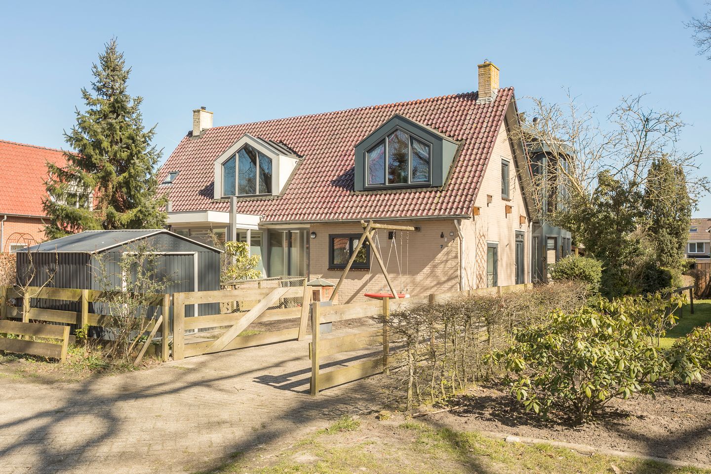 Aan de voorzijde heeft de woning een oprit met ruimte voor meerdere auto’s. Er is een bergschuur en moestuintje. De achtertuin ligt op het oosten en heeft een goede zonligging. Er is een schuurtje voor fietsen of tuingereedschap en een heerlijk brede overkapping om beschut van het buitenleven te kunnen genieten.