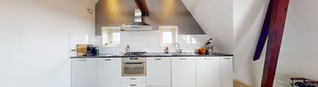 Zodra je het appartement binnenstapt, valt één ding meteen op: het licht. Grote ramen rondom, een speelse indeling en hoge plafonds zorgen voor een open en luchtige sfeer. De zichtbare houten balken geven de ruimte een warme, bijna loftachtige uitstraling — perfect voor wie houdt van karakter én moderne woonkwaliteit.