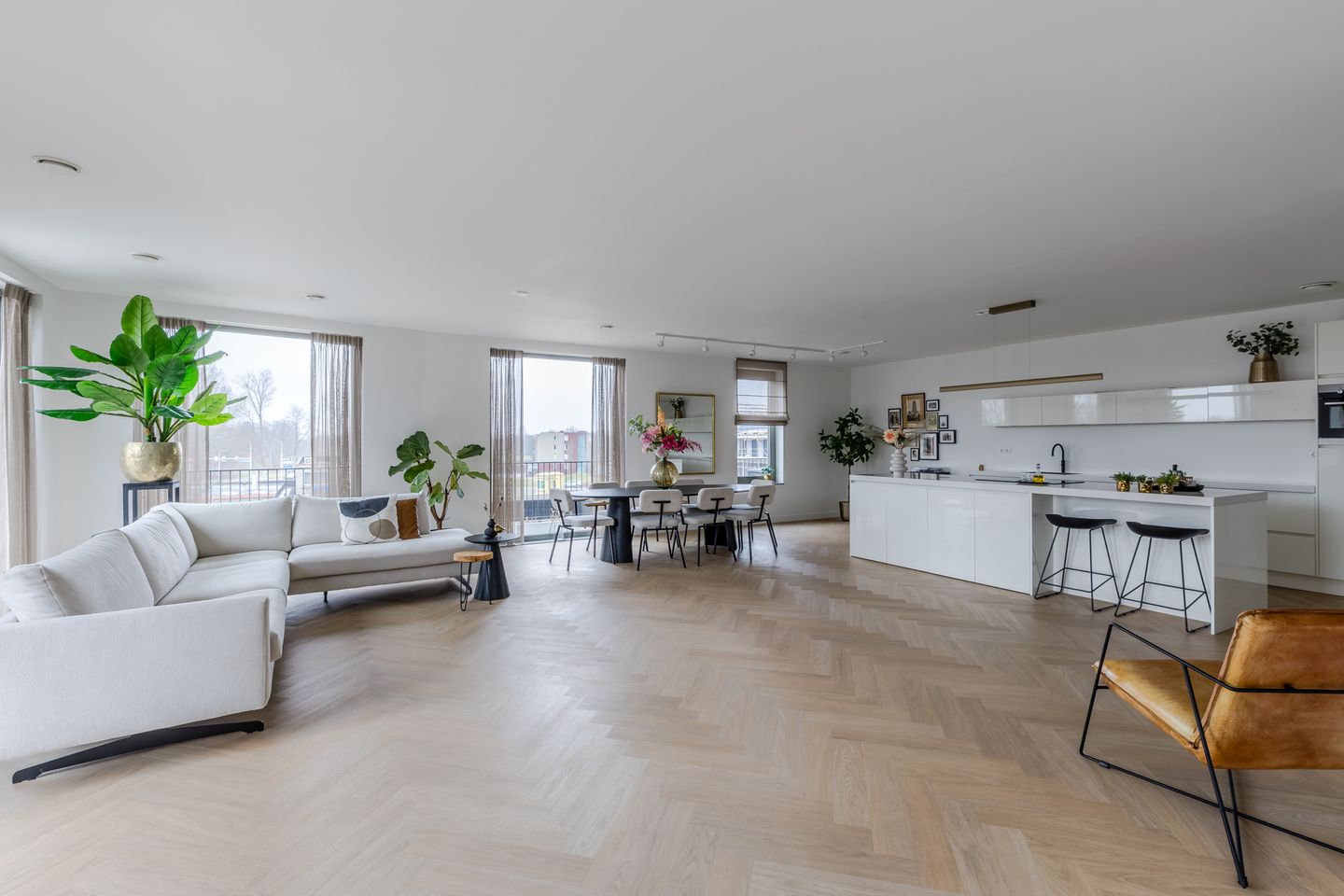 De lichte woonkamer met open keuken geniet van ontzettend veel lichtinval door de ligging op een hoek met grote raampartijen. Er is een mooi vrij uitzicht over de omgeving en vanuit de woonkamer is er tevens toegang tot het riante eigen dakterras.