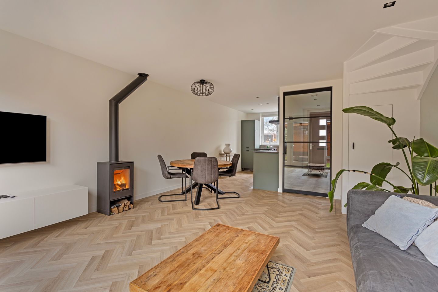 Een taatsdeur leidt naar de gezellige woonkamer aan de achterzijde waar een houtkachel voor extra sfeer zorgt en openslaande deuren leiden naar de achtertuin. Praktisch is de trapkast.