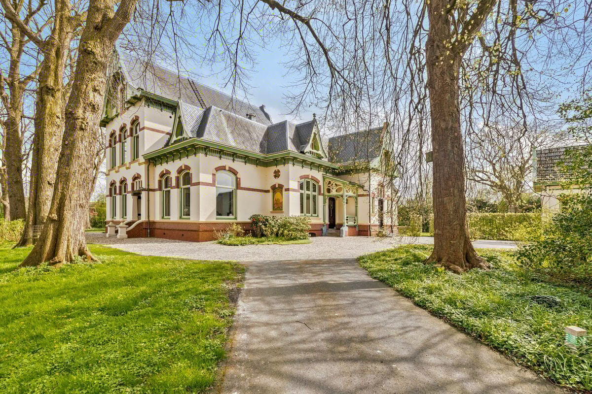 Begane grond: hoofdentree met vestibule, grootse centrale hal met statige trap en marmeren vloer, toiletgroep, indrukwekkende kamer-en-suite met rijk gedecoreerde plafonds, glas-in-lood ramen en tuinserre (totaal ca. 80m²), slaapkamer met privé badkamer-en-suite v.v. bad, douche, wastafel en toilet, zijentree met prachtige vloer, woonkeuken met keukeninrichting v.v. klassiek fornuis met oven, schouw, vaatwasser, koelkast en vriezer, zijentree, bijkeuken/wasruimte, tot besluit een prachtige werk- of dinerkamer aan de voorzijde.