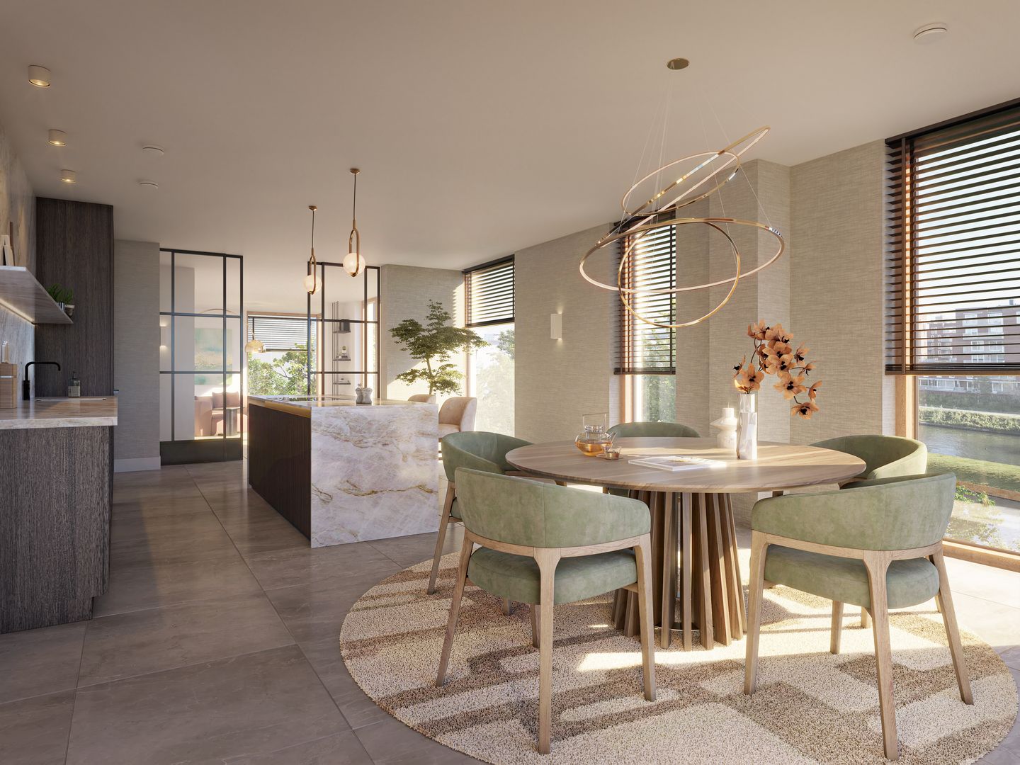 Uitgestrekt over het andere gedeelte van de woning ligt het royale leefgedeelte waar alles samenkomt: relaxen, koken en uitgebreid dineren. De grote ruimte is in te delen in meerdere zones: een open keuken met meer dan genoeg plek voor een kookeiland of grote gezellige eettafel, een comfortabele zithoek om te ontspannen met een boek of film. Je hebt eindeloos veel opties om dit gedeelte helemaal in te vullen naar eigen smaak en behoefte. Op zonnige dagen vergroot je je leefruimte met het riante balkon, die grenst aan de keuken. Hier geniet je in alle privacy van de zon en het prachtige uitzicht.