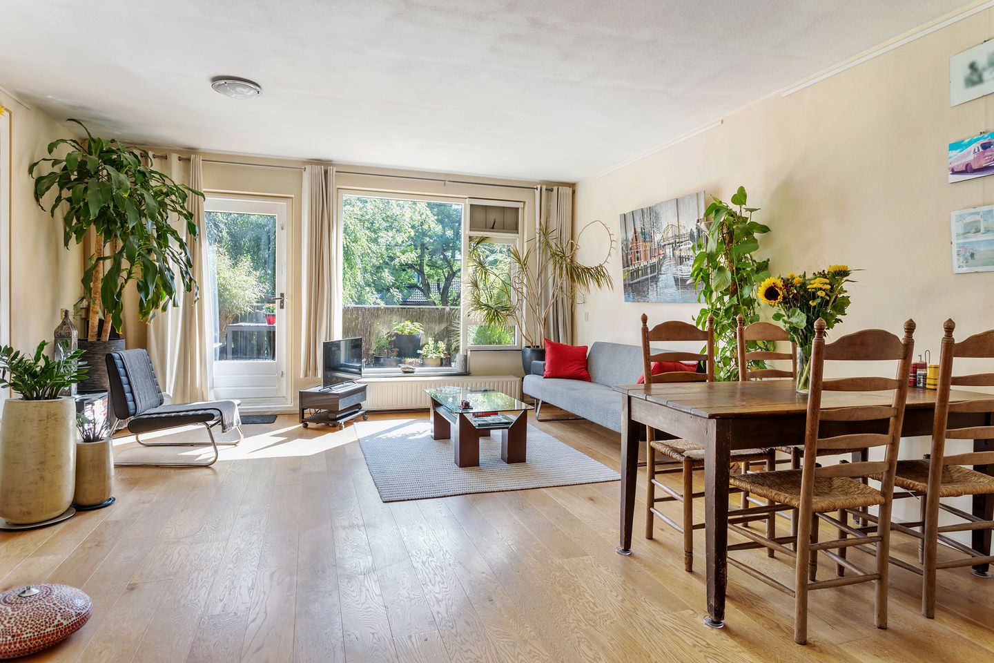 - Grote, open leefruimte met kamerbrede raampartij en houten vloer;