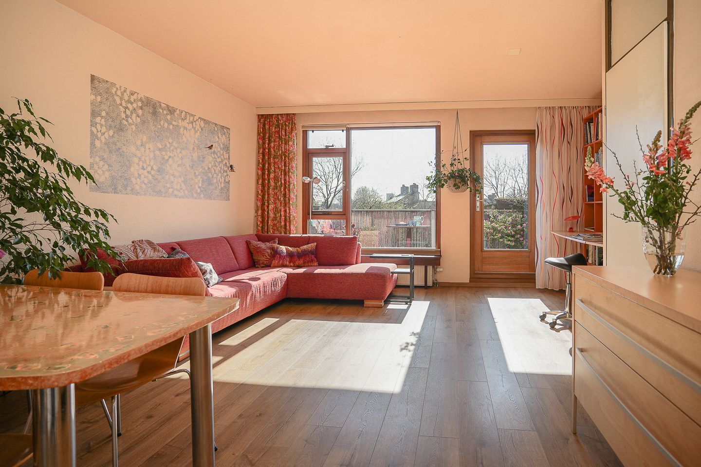 Entree met toilet, garderobekast en trap naar boven. De woonkamer is opvallend licht door de grote raampartijen en biedt een prettige leefruimte met voldoende plek voor een royale eettafel en een comfortabele zithoek.
