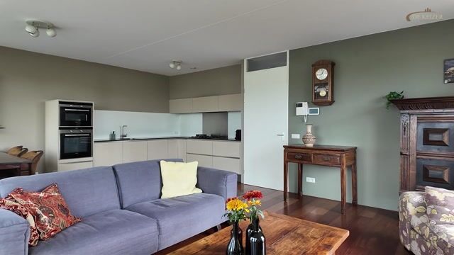 De open keuken in hoekopstelling beschikt over moderne inbouwapparatuur zoals een gaskookplaat, afzuigkap (met afvoer door het dak), heteluchtoven en een combimagnetron, koelkast en een vaatwasser. Zowel in de woonkamer als de gang ligt een Jatoba lamelparket vloer.