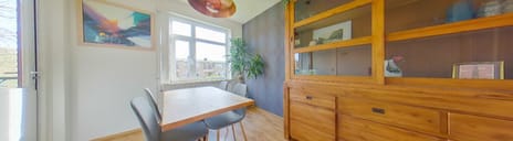 De woonkamer is royaal opgezet en heerlijk licht dankzij de grote raampartijen aan de voorzijde. De originele doorzonindeling is behouden: de woon- en eetkamer zijn gescheiden, maar visueel verbonden via een glazen wand. Vanuit de eetkamer heb je toegang tot het tweede balkon op het oosten, met vrij uitzicht over een uitgestrekte groene binnentuin.