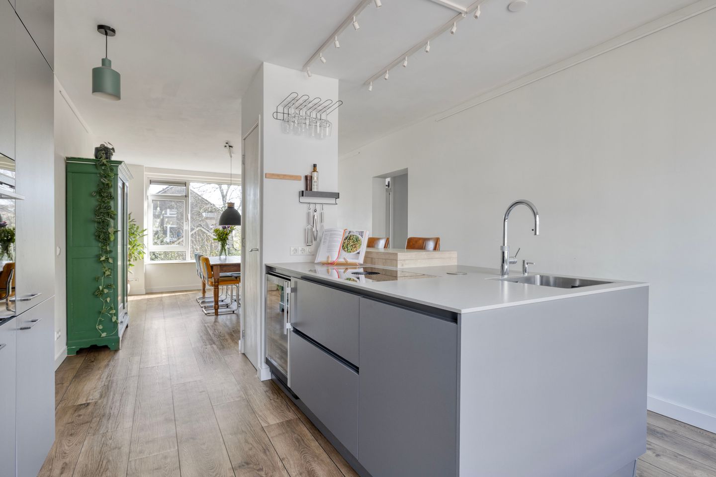 De voordeur vinden we op de eerste verdieping en hier komen we aan de zijkant binnen in de geweldige leefkeuken die is voorzien van een kookplaat met ingebouwde afzuiging, wijnklimaatkast, koel-vriescombinatie, vaatwasser, oven, combi-stoomoven en een quooker. Méér dan compleet dus.
