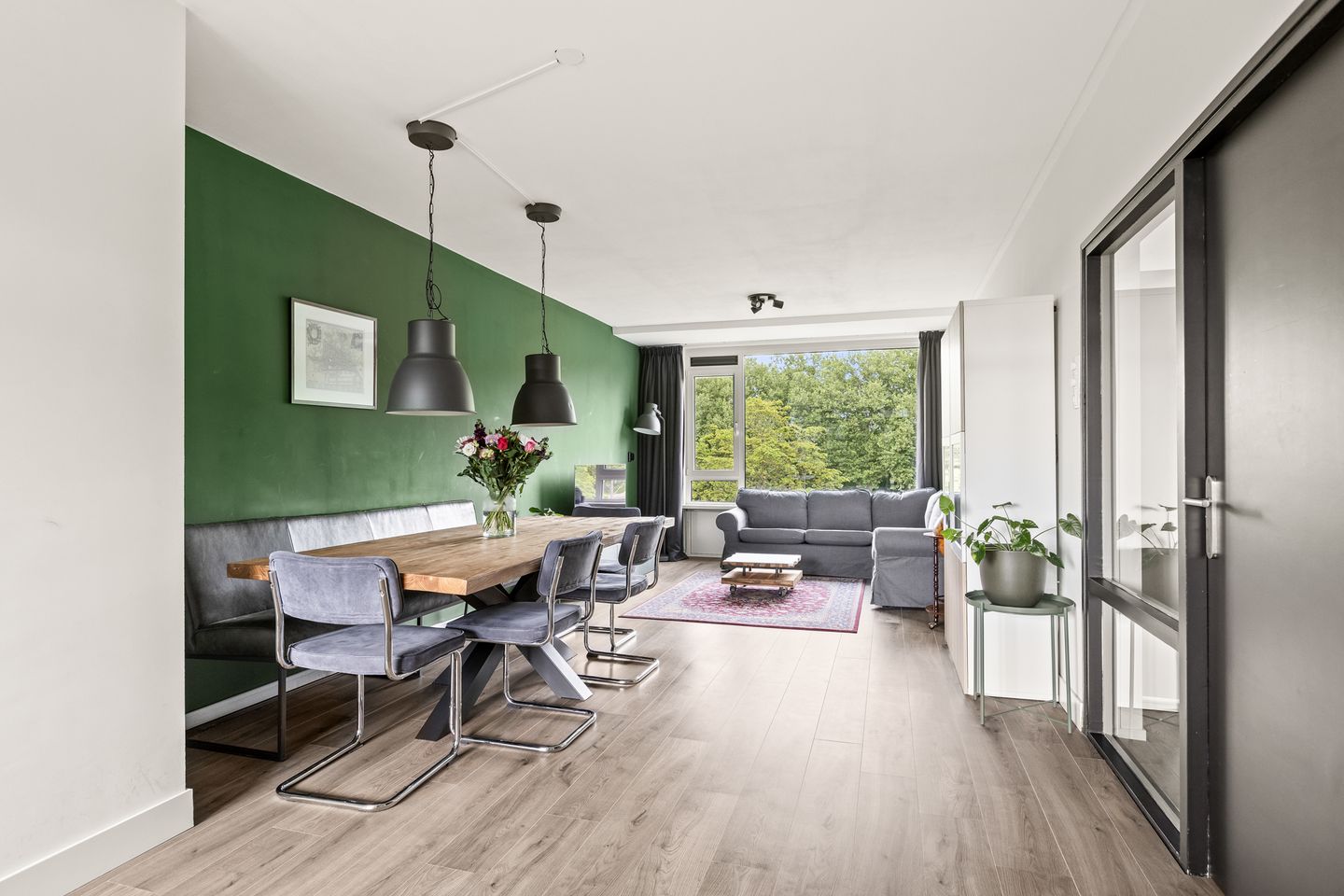 In de woonkamer is voldoende ruimte voor een gezellige zithoek én een praktische eethoek. Of je nu samen wilt borrelen, een goede serie kijkt op de bank of urenlang wilt tafelen met vrienden: hier kan het allemaal. Grote ramen zorgen ook hier voor veel lichtinval en een groen uitzicht.