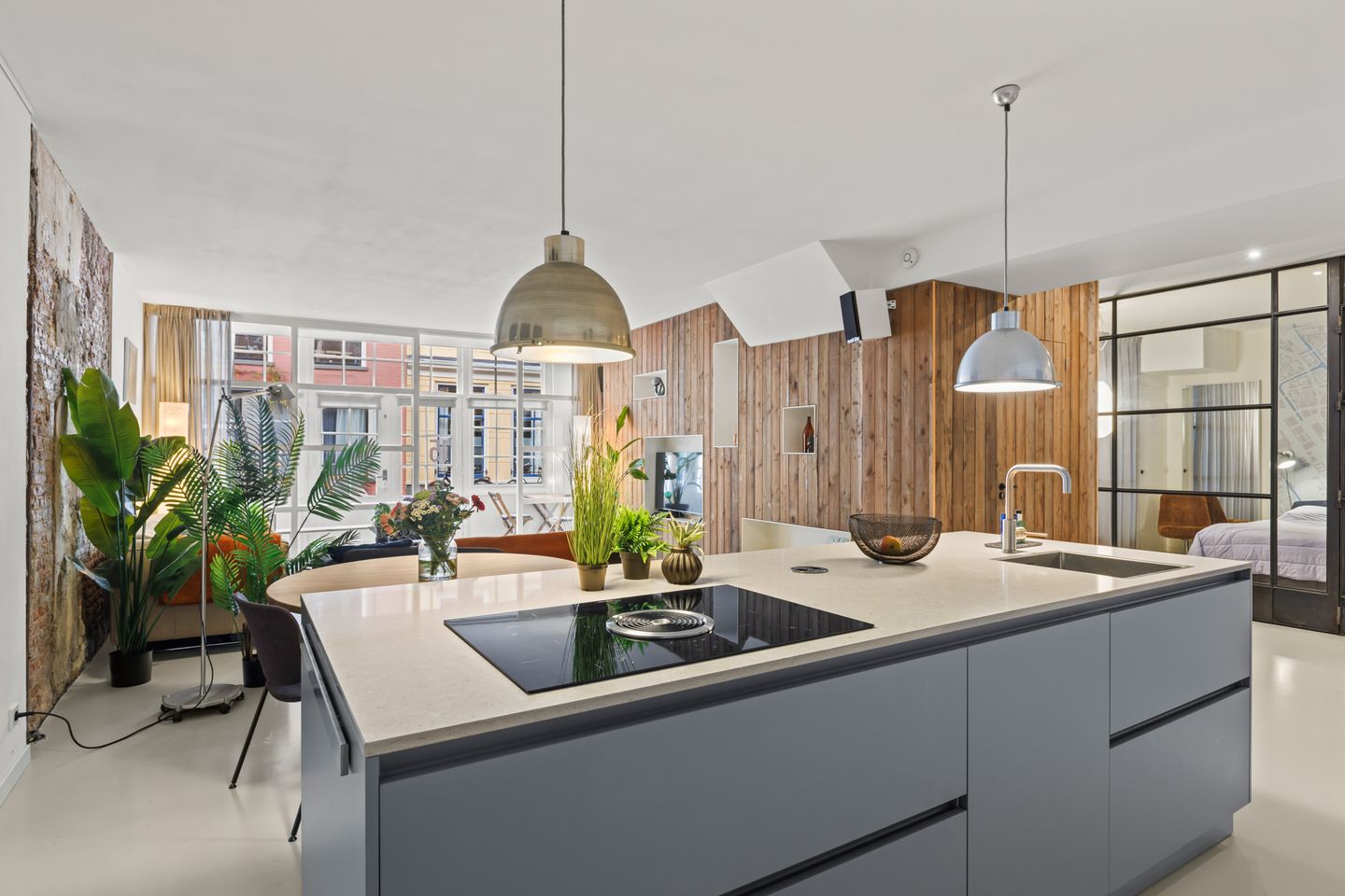 De stijlvolle open keuken met kookeiland is voorzien van een stenen blad en high-end apparatuur, waaronder een Bora inductiekookplaat met geïntegreerde afzuiging. Achter de keuken vind je een royale bijkeuken met natuurstenen vloer, extra vaatwasser en doorgang naar de wasruimte. Verder vind je een luxe badkamer met inloopdouche en designwastafel, een modern toilet en twee prachtige kamers. De kamer aan de voorzijde heeft zelfs een directe deur naar de straat: ideaal als werkruimte of atelier. Dankzij de glazen stalen wanden voelt alles heerlijk licht en open.
