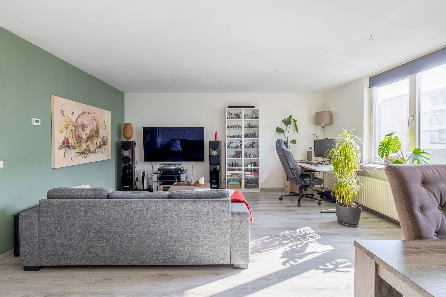 De woonkamer is ruim opgezet en met de ligging op het zuiden komt er veel daglicht de ruimte binnen. Hier creëer je eenvoudig een comfortabele zithoek en een gezellige eethoek.