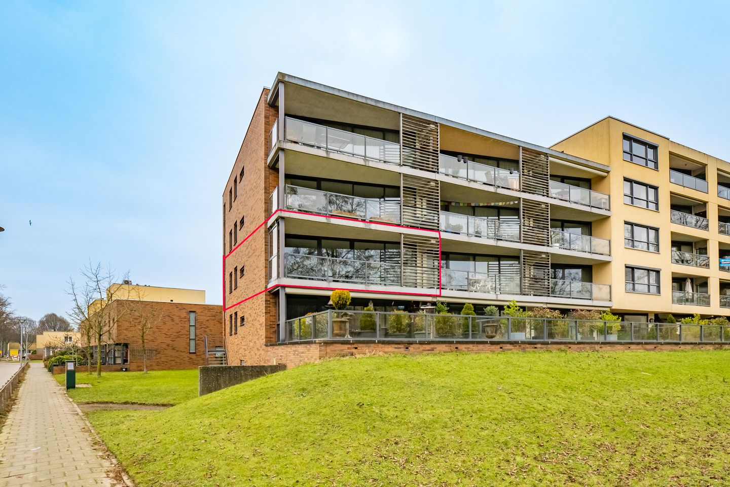 Het balkon, gelegen op het zuiden, strekt zich uit over de volledige breedte van het appartement en biedt een vrij uitzicht over de groene omgeving. De perfecte plek om te genieten van een diner of een ontspannen moment in de zon.