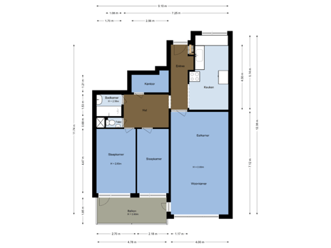Je komt binnen in de ruime hal die toegang geeft tot alle vertrekken van het appartement. Vanuit de hal bereik je de halfopen keuken, woonkamer, twee slaapkamers, het separate toilet, kantoor en de badkamer.