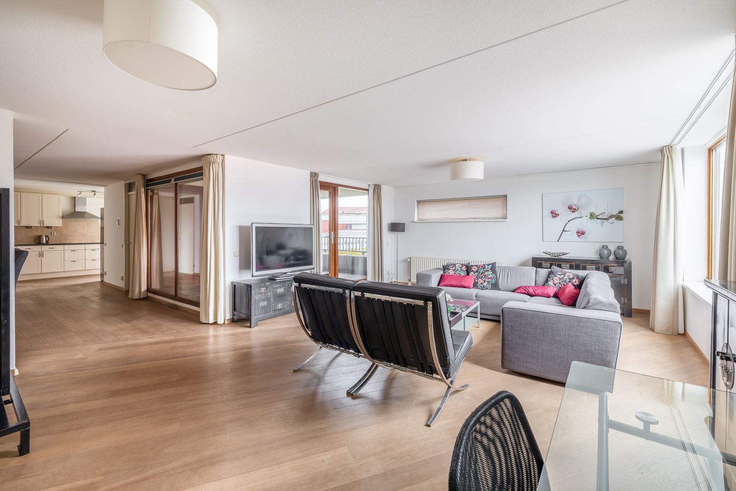 De houten vloer, diagonaal gelegd, versterkt het gevoel van ruimte en klasse. De combinatie van licht, hout en uitzicht zorgt voor een serene en huiselijke sfeer. En terwijl je ontspant op de bank, vang je in de verte een glimp op van de Domtoren, het trotse symbool van Utrecht.