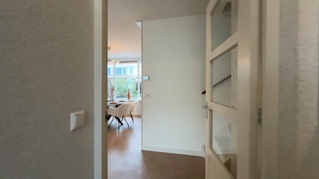 Je betreedt de woning via een ruime hal met voldoende plaats voor een garderobe. Vanuit hier heb je toegang tot het verzorgd afgewerkte toilet. Zodra je de woonkamer binnenstapt, valt direct de ruimte en de prettige lichtinval op. Woningen uit de jaren ’70 staan bekend om hun doorzonwoonkamers met grote raampartijen, en dat is hier duidelijk terug te zien. Dankzij de open indeling voelt de begane grond bijzonder ruimtelijk aan.
