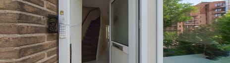 Begane grond: Vanaf straatniveau bereik je via een kleine trap omhoog de voordeur van het huis.