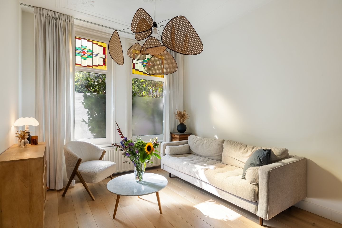 De woonkamer is ruim, licht en heeft een hoogte van 2,93 m. Je hebt grote ramen met glas in lood bovenlichtjes aan de voorzijde en de schuifpui aan de achterzijde die de ruimte verbindt met de stadstuin. Vanuit het eetgedeelte ben je in open verbinding met de keuken en met de tuin. De eettafel is wel hét hart van het huis. Zie je het al voor je? De schuifpui open, een lange avondtafel met vrienden, een glas wijn in de hand terwijl de kinderen in de tuin spelen.