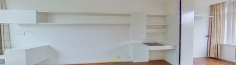 De overloop biedt toegang tot drie slaapkamers en de badkamer. Aan de achterzijde bevindt zich een zeer royale slaapkamer over de volle breedte van de woning. Deze kamer is voorzien van vaste kastruimte en een praktische roomdivider met ingebouwde opbergvakken en werkblad – ideaal als inloopkast of werkhoek. Aan de voorzijde liggen nog twee slaapkamers, waarvan één compact maar geschikt als kinderkamer of thuiswerkplek, en één goed bemeten tweede slaapkamer. De eenvoudige badkamer is volledig betegeld en uitgerust met een douchecabine, toilet en wastafel.