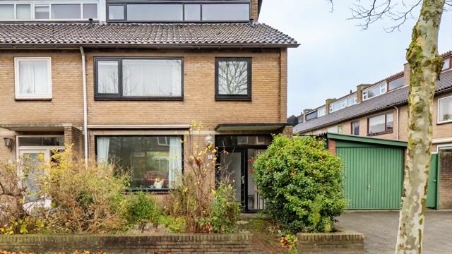 Via de groene voortuin bereik je de entree van de woning. Je stapt binnen in de hal met meterkast, toilet en trapopgang. De hal is voorzien van een lichte tegelvloer en biedt toegang tot de woonkamer en keuken. De doorzonwoonkamer is ruim opgezet, met grote raampartijen aan zowel de voor- als achterzijde die zorgen voor een prettige lichtinval. De vloer is afgewerkt met een klassieke houten parketvloer in blokmotief. De halfopen keuken is functioneel ingericht met een licht keukenblok, granieten werkblad en diverse inbouwapparatuur. Vanuit de keuken loop je zo de beschutte achtertuin in, waar je veel privacy vindt tussen het groen. De tuin beschikt over een ruime stenen berging met elektra en een praktische achterom