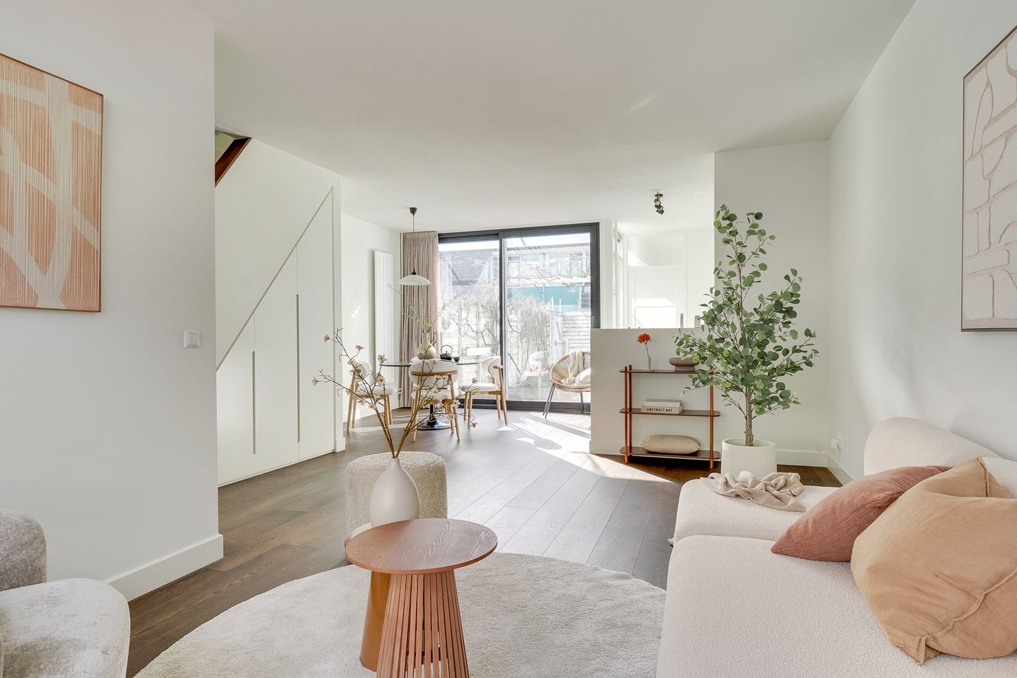 Entrance hall with an open foyer and modern restroom. From the foyer, you step into the spacious living room (approx. 5.6 x 3.2 m), which is pleasantly bright thanks to the large windows at the front and rear. Under the stairs, they have created beautiful built-in cabinets for extra storage space. From the living room, you have an open view of the kitchen and the dining room at the rear. The dining room (approx. 4.1 x 3.1 m) is wonderfully bright thanks to the large, renovated front facade and is therefore directly connected to the garden and the terrace, creating a spacious and open feeling. The semi-open modern kitchen (approx. 3.6 x 2 m) is also located at the rear and is practically laid out with ample work and storage space, fully equipped with a gas stove, oven, fridge-freezer, and a dishwasher. Adjacent to the kitchen is the utility room/storage room (approx. 3x2m), ideal for extra storage or office space. You also have a lovely, deep garden with a neat terrace where you can enjoy your coffee (approx. 9.50x5.5) in the sun, as the house faces south! Furthermore, this garden has a convenient back entrance.