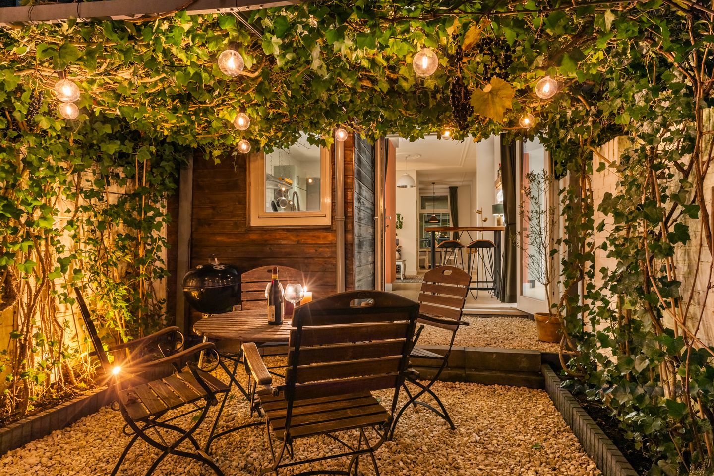 Op zonnige dagen lopen binnen en buiten naadloos in elkaar over. De openslaande deuren brengen je naar de achtertuin, waar de tijd lijkt stil te staan. Onder een groene hemel van klimop en druivenranken geniet je van beschutting, privacy en een bijna mediterrane sfeer. De tuin is onderhoudsarm aangelegd met grind, sfeerverlichting en ruimte voor een grote eettafel, een plek die uitnodigt tot lange zomeravonden. Achterin bevindt zich een stenen bijgebouw, omgetoverd tot een geïsoleerde werkruimte: een rustige plek waar je in alle stilte kunt werken of juist tot rust komt.