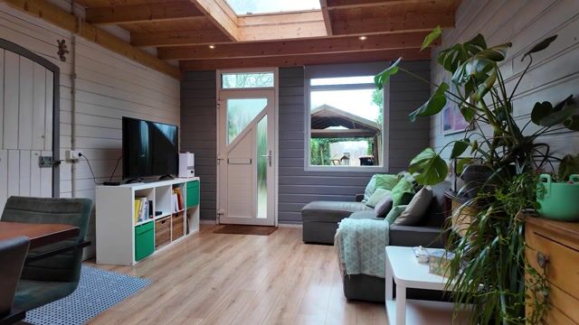 Vanuit deze multifunctionele ruimte betreedt u het oorspronkelijke woonhuis. Hier komt u in de woonkamer met vide, openslaande deuren en een houtkachel. In het zitgedeelte reikt het plafond tot in de nok, wat zorgt voor een open en ruimtelijk gevoel. Ook bevindt zich hier de open keuken, voorzien van diverse inbouwapparatuur en met een doorgang naar buiten. De badkamer is uitgerust met een toilet, inloopdouche en wastafelmeubel en is dankzij het dakraam een prettige, lichte ruimte. Via een vaste trap bereikt u de verdieping, die momenteel is ingericht als royale slaapkamer met wastafelmeubel.