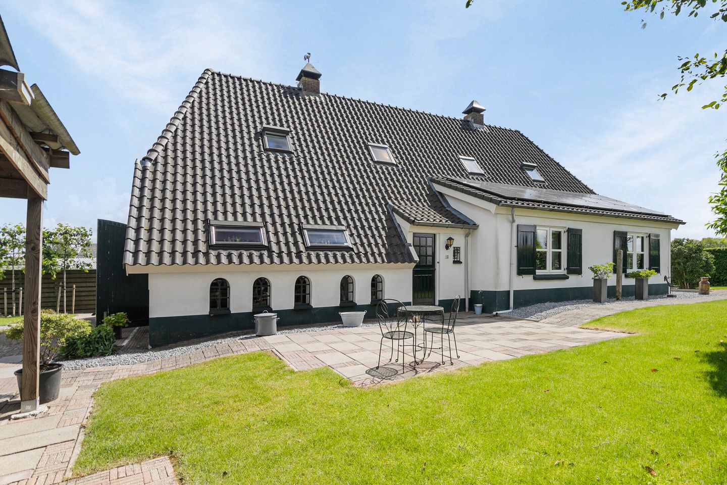 Het perceel is aan de achterzijde afgezet middels een fraai sierhekwerk met 2 dubbele inrijpoorten. De inrijpoort bij de carport is elektrisch bedienbaar. Via de lange oprijlaan en de zijtuin is de entree aan rechterzijde van de woonboerderij te bereiken. Ruime en lichte hal met fraaie trappartij naar de 1e verdieping, kleine trapkast, modern wandtoilet met fontein. Via een loopdeur in de brede glaspui (met roedeverdeling) is de woonkamer te bereiken.
