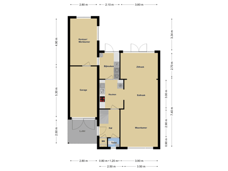 Vaak gaat een werkkamer op de begane grond ten koste van de garage, maar hier is dat niet het geval. De garage is nog steeds 5,3 meter lang (binnenmaat) en is de ideale stallingsruimte voor (elektrische) fietsen en/of een motor. Er zou dan nog steeds voldoende ruimte kunnen overblijven voor een werkbank.