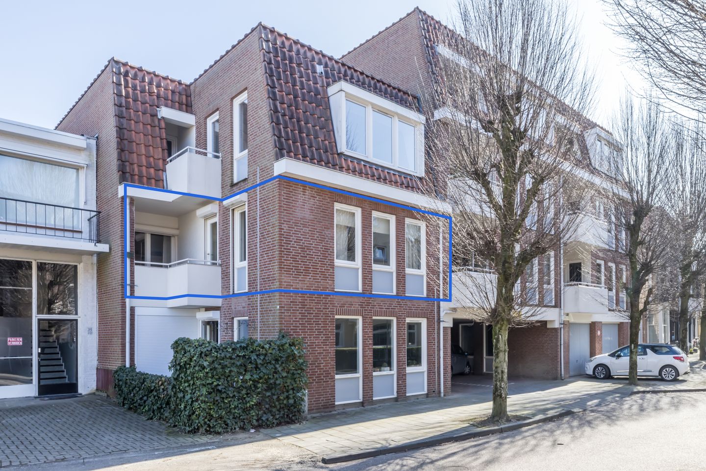 Overdekte centrale entree met bellenpaneel en brievenbussen; trappenhuis; ruime garage annex berging.