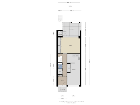 Begane grond: inkomhal, toilet, kamer, inpandige garage, terras/tuin