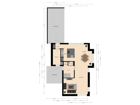 • Onder architectuur aangelegde achtertuin met grandioos-, overdekt terras. Dit terras is voorbereidt als basis voor een extra aanbouw (bijvoorbeeld slaapkamer begane grond)