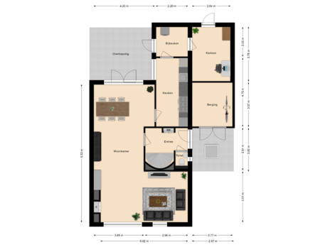 Overdekte entree aan zijgevel. Binnenkomst in ruime hal met toiletruimte, meterkast en trapopgang. Woonkamer in L-vorm waarbij de hoek aan de voorzijde voldoende groot is om te dienen als TV-hoek en er dus ruimte over is voor bijvoorbeeld een speelhoek. Achterin is er ruimte voor een grote eettafel, middels openslaande deuren toegang tot het overdekt terras en aangrenzend de keuken.