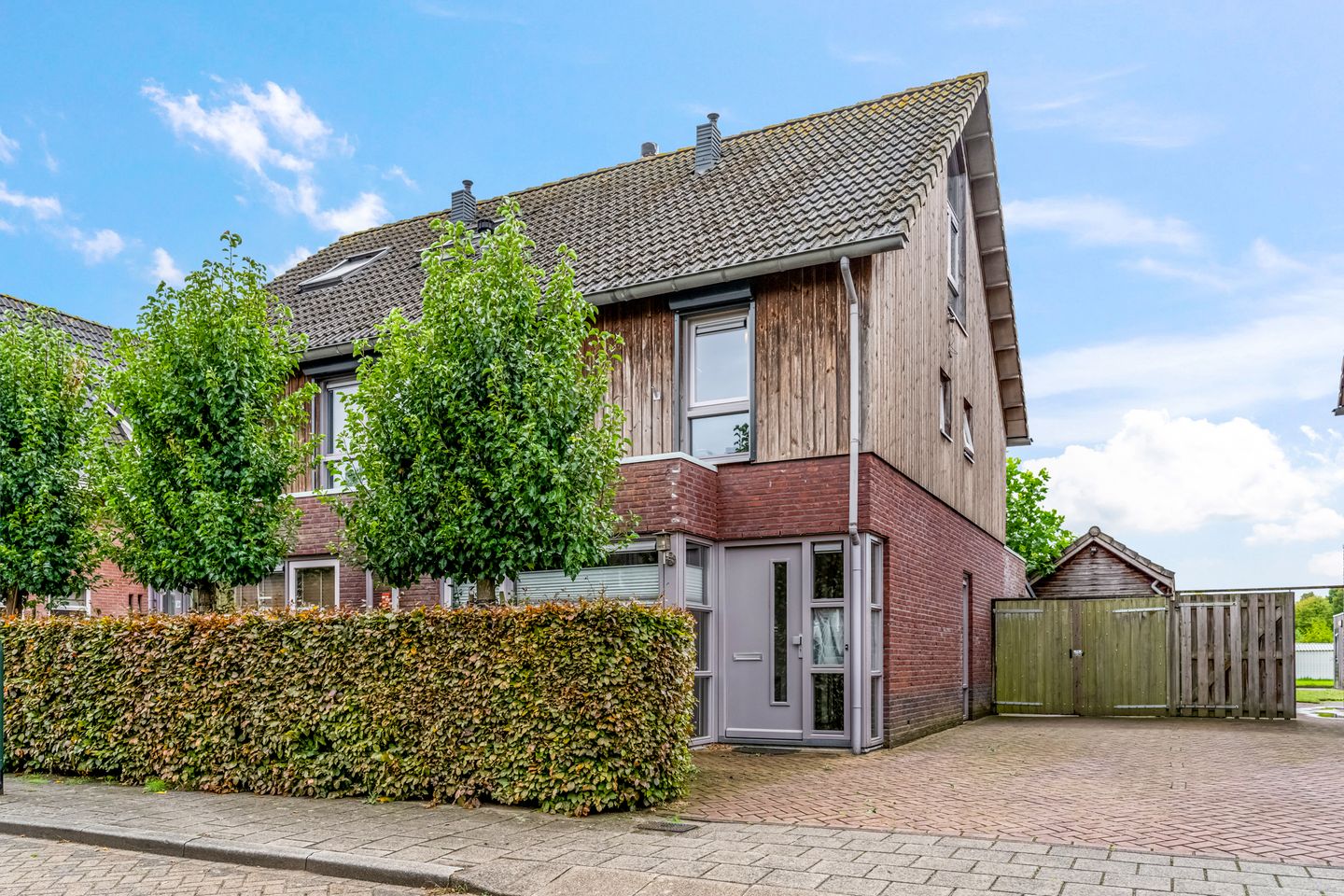 In heerlijk rustige woonomgeving gelegen tref je deze royale twee onder een kap woning met garage, oprit en flinke zonnige achtertuin grenzend aan weiland.