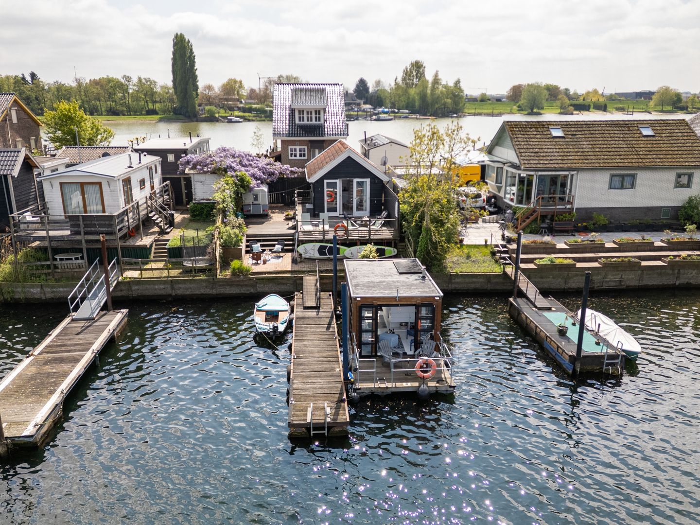 De woning ligt aan het open vaarwater van de schilderachtige Veense Plassen, een paradijs voor watersporters en natuurliefhebbers. De omgeving is rijk aan groen, water en rust, met hier en daar een kwakende eend voor de gezelligheid. Toch is de bewoonde wereld nooit ver weg: binnen 6 minuten fietsen sta je bij de dichtstbijzijnde supermarkt. Ideaal dus – je kunt in de natuur wonen zonder de bewoonde wereld vaarwel te zeggen.
