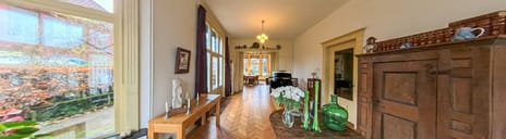 Via het charmante voorportaal met glas-in-looddetails bereikt u de lange, statige hal waar de hoogte van 3,3 meter direct opvalt. De visgraat parketvloer versterkt de warme en elegante uitstraling. De woonkamer vormt een heerlijke leefruimte. Grote raampartijen zorgen voor een prachtige lichtinval en de sfeervolle houthaard maakt het geheel compleet. Dankzij de oorspronkelijke ensuite-deuren staat de kamer in open verbinding met de woonkeuken, maar kan deze ook eenvoudig worden afgesloten voor meer intimiteit. De woonkeuken is bijzonder ruim en licht, met hoge ramen rondom die een fraai zicht geven op de omgeving. De keuken is ingericht met een inductiekookplaat, oven, afzuigkap, koelkast en vaatwasser. Hier is volop plek voor een grote eettafel, waardoor het een uitnodigende woonkeuken is waar koken en samenkomen centraal staan.