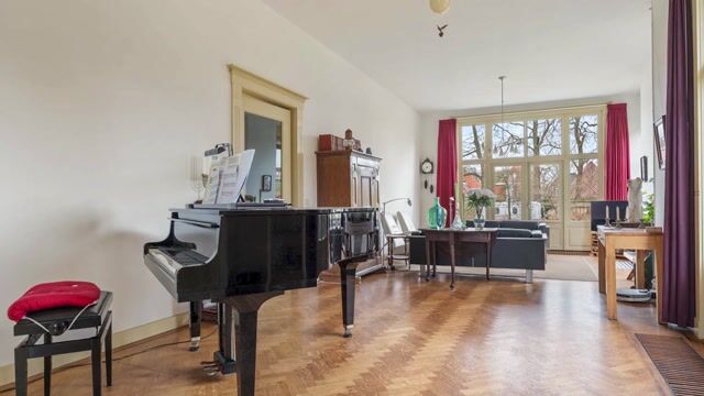Via het charmante voorportaal met glas-in-looddetails bereikt u de lange, statige hal waar de hoogte van 3,3 meter direct opvalt. De visgraat parketvloer versterkt de warme en elegante uitstraling. De woonkamer vormt een heerlijke leefruimte. Grote raampartijen zorgen voor een prachtige lichtinval en de sfeervolle houthaard maakt het geheel compleet. Dankzij de oorspronkelijke ensuite-deuren staat de kamer in open verbinding met de woonkeuken, maar kan deze ook eenvoudig worden afgesloten voor meer intimiteit. De woonkeuken is bijzonder ruim en licht, met hoge ramen rondom die een fraai zicht geven op de omgeving. De keuken is ingericht met een inductiekookplaat, oven, afzuigkap, koelkast en vaatwasser. Hier is volop plek voor een grote eettafel, waardoor het een uitnodigende woonkeuken is waar koken en samenkomen centraal staan.