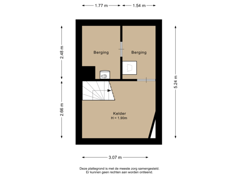 Kelder, 16 m², stahoogte 1.9 meter ingedeeld met berging t.b.v. wasruimte (3.8 m²) en opstelling warmtepomp (4.4 m²).