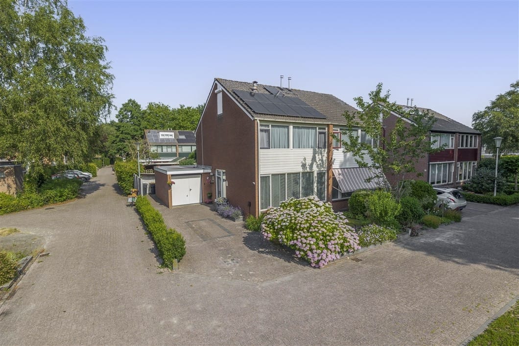 Aan de achterzijde van de woning is de tuin gelegen op het Westen, deze heerlijke buitenruimte van 143 m², beschikt over meerdere terrassen, een grasveld, veel groen maar ook nog over een tuinhuis en een overkapping. De royale oprit is gelegen tot aan de garage en biedt parkeergelegenheid voor meerdere auto's.