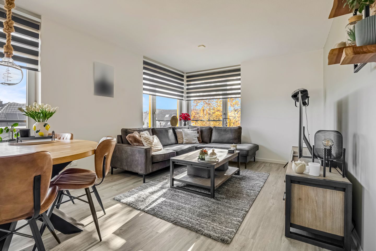 Vanuit de hal stap je de woonkamer in. De grote ramen laten veel licht binnen en door de hoekligging voelt het hier lekker ruim aan. Er is genoeg plek voor een comfortabele zithoek en een eettafel om met vrienden of familie aan te schuiven.