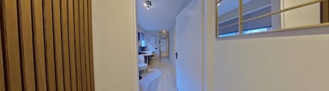 Terug in de hal bereikt u als eerste de slaapkamer, een fijne en rustige ruimte van circa 13 m². Dankzij de grote vaste kast met spiegeldeuren heeft u volop opbergruimte en voelt de kamer meteen lekker ruimtelijk. Het Franse balkon zorgt voor een vleugje charme en extra lichtinval, waardoor dit écht een plek is waar u graag wakker wordt. Direct naast de slaapkamer vindt u de moderne, volledig betegelde badkamer van 5,2 m². De combinatie van grote matte witte wandtegels en een leisteen-look vloer geeft de ruimte een frisse en eigentijdse uitstraling. De badkamer is voorzien van een comfortabele kwartronde douchecabine voorzien van regendouche met thermostaatkraan en een praktisch wastafelmeubel met spiegel. Het geheel wordt compleet gemaakt door een designradiator en een lichtkoepel voor natuurlijk lichtinval. Ten slotte zijn hier de aansluitingen voor de wasmachine en wasdroger ondergebracht, ideaal als u alles graag bij de hand heeft. In de hal bevindt zich ook het separate toilet, volledig betegeld in dezelfde stijl als de badkamer en voorzien van een fonteintje. Daarnaast is er een aparte cv-ruimte met de cv-combiketel (Intergas Kompakt HRE, '18). Alles bij elkaar vormen deze ruimtes een comfortabele, praktische en sfeervolle basis waar u als starter direct prettig kunt wonen.