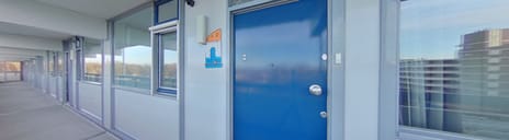 Op de vierde verdieping stap je het appartement binnen via het voorportaal, waar zich de meterkast en een vaste kast met de CV-installatie bevinden. De ruime hal die volgt, vormt het hart van de woning en biedt toegang tot vrijwel alle vertrekken. De sfeer voelt direct goed.