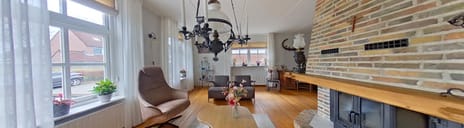 De riante living is een heerlijke plek om te ontspannen. Ook de gezellige en functionele houtkachel draagt hier aan bij. Dankzij de vele raampartijen is deze ruimte royaal en licht.